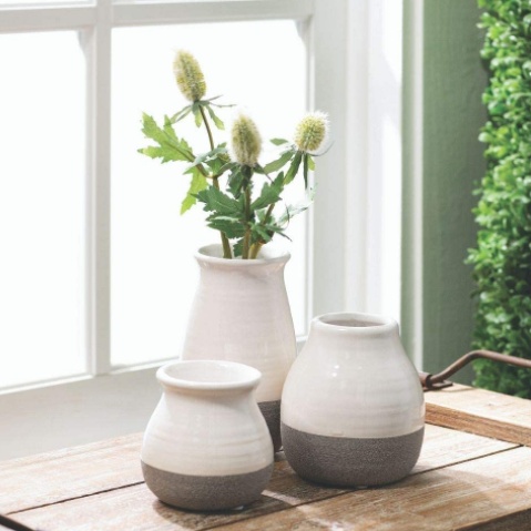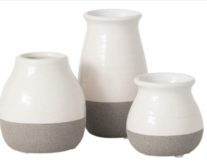 A beautiful collection of 3 two-tones petite ceramic vases. Their modern farmhouse feel makes them a beautiful accent in any space. Style alone or use them to hold a delicate floral.